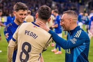 巴萨中场佩德里赛后与皇家奥维耶多40岁中场卡索拉交流,巴萨官方社媒晒出视频,配文:“两位球场魔术师。”